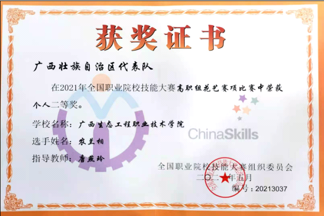 6月16日至20日,2021年全国职业院校技能大赛高职组花艺赛项在山东济南举办。pg娱乐园林与城乡规划学院参赛选手农兰相代表广西参赛,与来自全国32支代表队进行为期三天的激烈角逐,最终以总分第四的好成绩斩获全国二等奖。