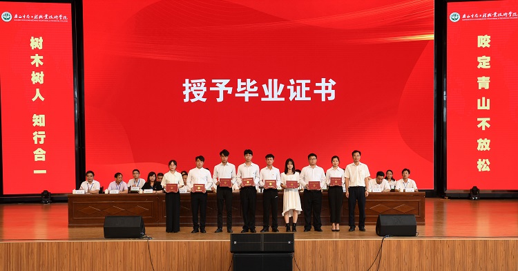 全体参礼人员齐唱国歌拉开毕业典礼帷幕。校长冯昌信教授致辞指出,值此毕业之际,我们迎来中国共产党百年华诞,开启了全面建设社会主义现代化国家的伟大新征程,希望即将踏上工作岗位的同学们永葆胸怀家国理想,践行“树木树人,知行合一”的校训,走好人生的每一步路。并向同学们提出三点希望:一是自立自强,开拓人生的新境界。要负责担当,对家庭负责,对单位负责,对社会负责,同时要对自己负责,要不断攀升人生的高峰,开拓人生的新境界;二是坚定理想信念,秉持认真实干的态度。作为新时代的青年,应当志存高远,有坚定信念,将“咬定青山不放松”的学校精神内化于心、外化于行,实现自己的人生理想;三是心系家国,投身热爱的事业当中去。积极走向社会,投身到自己热爱的事业中去后,自觉地将个人前途命运与社会、民族和国家紧密联系起来,为民族复兴铺路架桥,为祖国建设添砖加瓦!