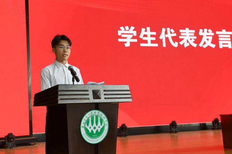 建筑与道桥工程学院建管182班刘咏杰同学作为毕业生代表发言。刘咏杰在发言中向学校、老师们表达了三年培育的感恩之情,并号召所有毕业生,未来需永葆初心,带着母校的厚望,勇往前行,在工作岗位上贡献青春力量,彰显学校精神。
