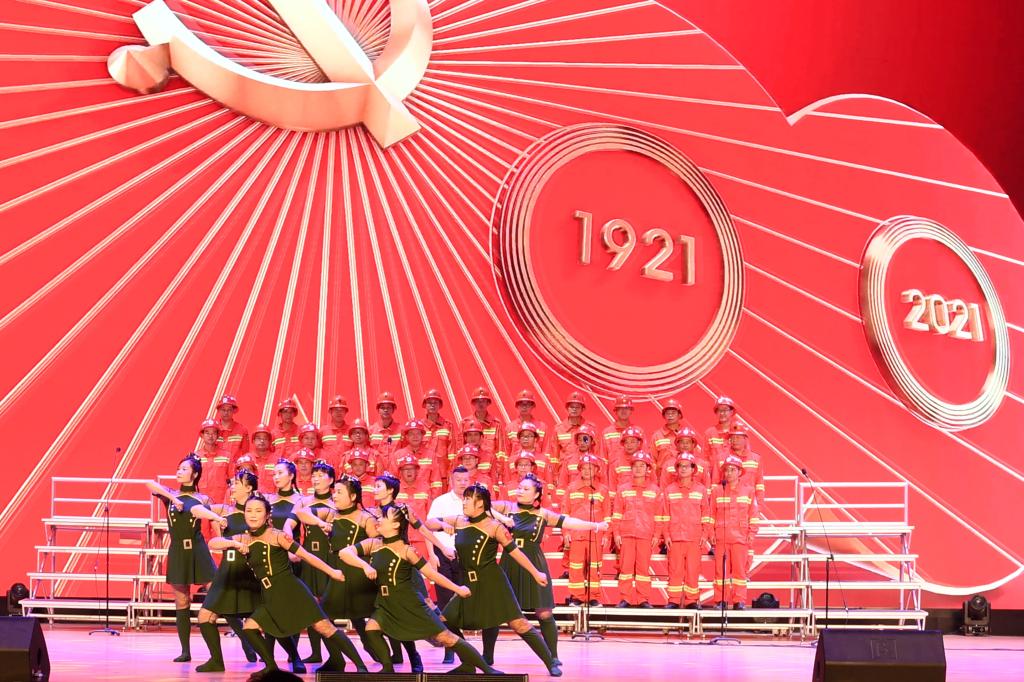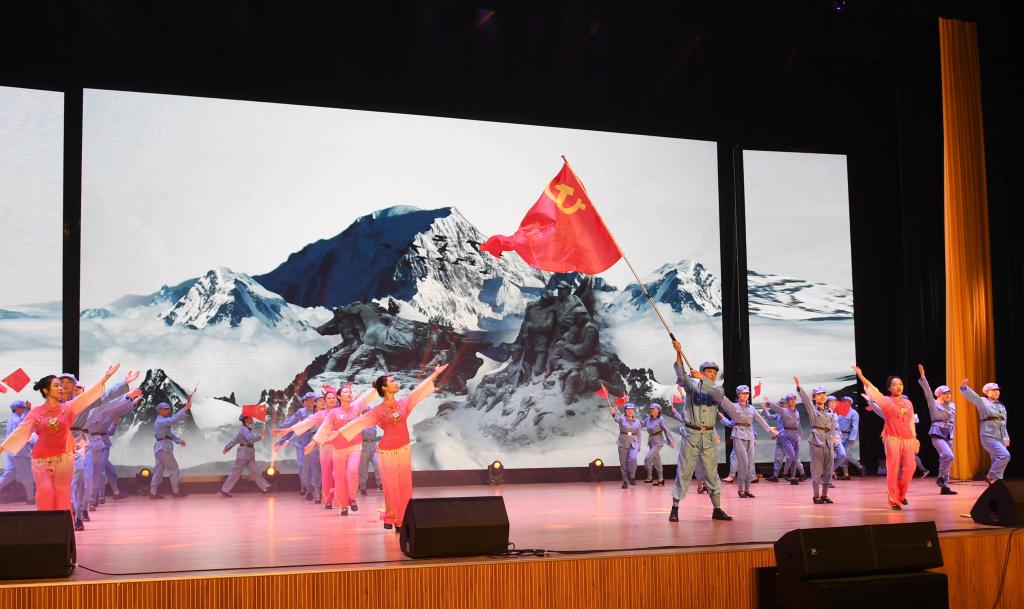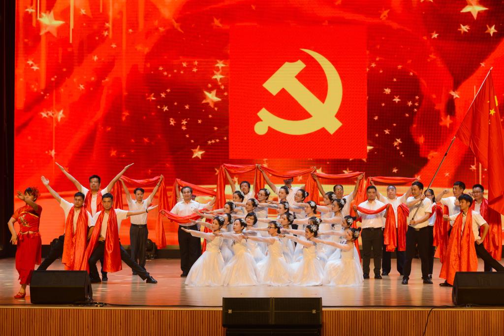 文艺晚会在学校领导和中层干部的大合唱《跟着共产党走》中拉开了序幕。本台晚会共分为“巨龙腾飞颂党恩”“唱支山歌给党听”“党旗熠熠添光彩”“不忘初心担使命”四个篇章。