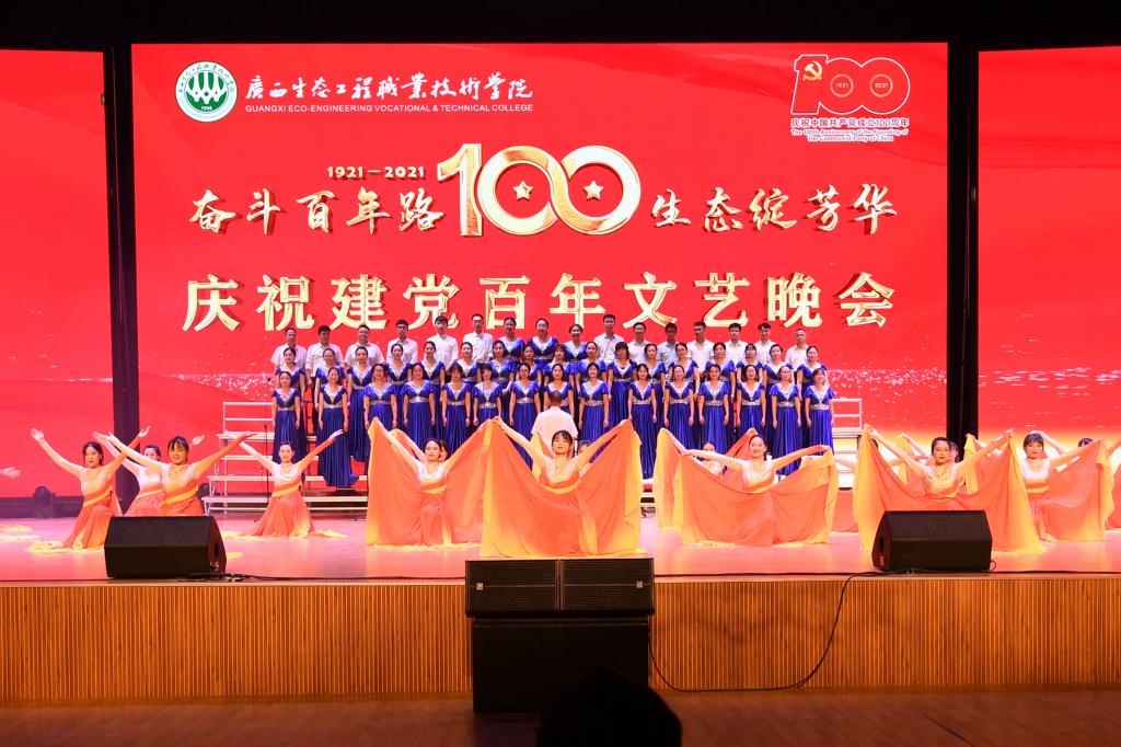 第三篇章“党旗熠熠添光彩”通过精彩的演绎,让我们透过历史的眼眸,站在岁月的肩膀上远眺,憧憬美好的未来。职能部门党员的舞蹈《山歌唱开扶贫花》、建工学院的舞蹈《我们都是追梦人》、旅游学院、经贸学院和环保学院的诗朗诵《丰碑·无价》、设计学院的舞蹈《灯火里的中国》一起回顾党的百年光辉历程,礼赞中国共产党带领中国人民所取得的丰功伟绩,表达了生态师生永远感党恩、听党话、跟党走的坚定信念。