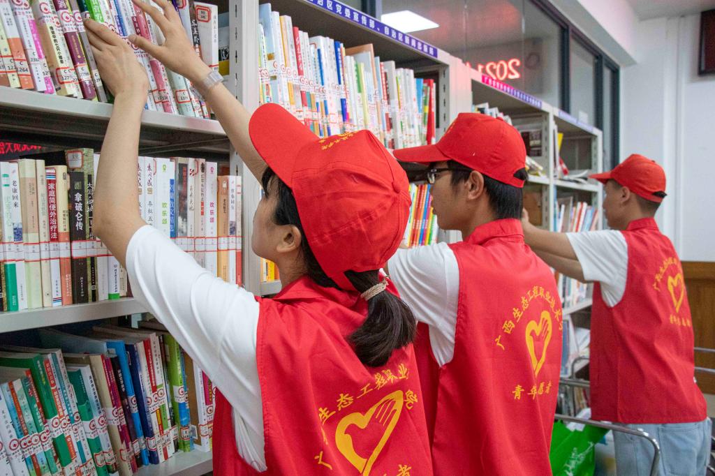 志愿者为当地农家书屋整理书架