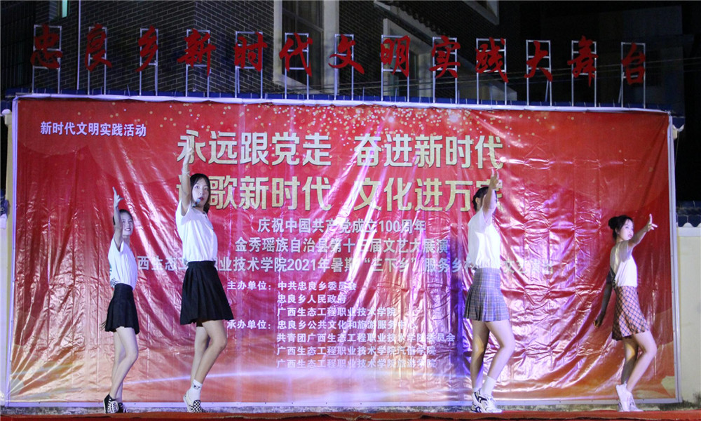 7月19日,pg娱乐电子游戏官网入口“百年荣光,我心向党”旅游学院文艺下乡实践队前往来宾市金秀瑶族自治县忠良乡开展暑期社会实践文艺活动,开展主题为“永远跟党走,奋进新时代,讴歌新时代,文化进万家”文艺晚会。