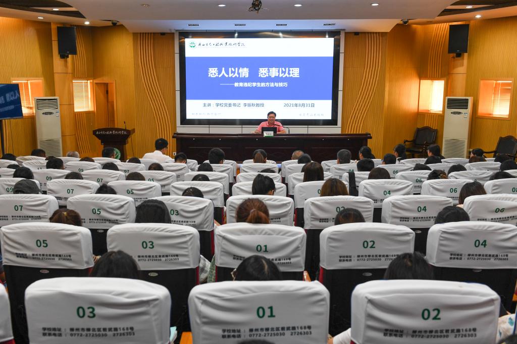 李振秋书记以《“悉人以情,悉事以理”——教育违纪学生的方法与技巧》为题,通过分享夸美纽斯在《大教学论》中关于学校纪律最为精辟的论述开篇,以问题为导向,从大学生违纪的主要表现、主要原因、主要特征,教育违纪学生的主要方法、处理程序、结果运用等六个方面进行了深度剖析,分享了他从事教育工作以来教育和转化违纪学生的成功案例,要做好学生的思想政治教育工作,首先要做到身教和言教相结合,身教重于言教。辅导员(班主任)面对新形势下新形态的违纪行为,要熟悉掌握相关法律法规,要学习掌握教育心理学,帮助违纪学生深挖根源,提前研判学生易出现的问题,及时教育及时转化。在批评教育或纪律处分过程中,要做到处理前须告知,处理中可申辩,处理后能申诉,确保处理程序的合法化、专业化、标准化及时效性。深入浅出地讲解了如何做好违纪学生的教育和管理,为辅导员在学生违纪工作中遇到的痛点和难点指明了方向。