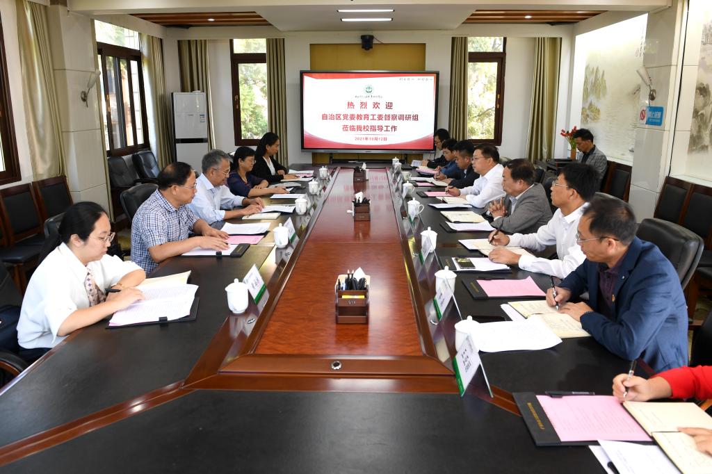 10月12日,自治区纪委驻教育厅纪检监察组组长、教育厅党组成员林华率全区高校巡视整改和党建工作督查调研组一行5人莅临pg娱乐开展巡视整改督查和党建工作调研。学校党委书记李振秋、副书记王汉奇,以及相关部门负责人参加了汇报会。