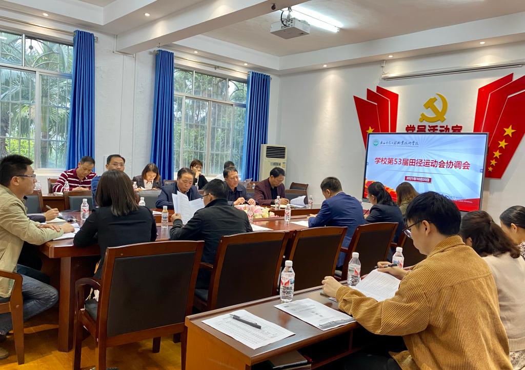 为确保学校运动会顺利召开,10月20日下午,第五十三届田径运动会协调会在通识教育学院会议室举行。学校党委副书记王汉奇出席会议,各职能部门及二级学院领导参加了此次协调会。会议由通识教育学院黄小民院长主持。