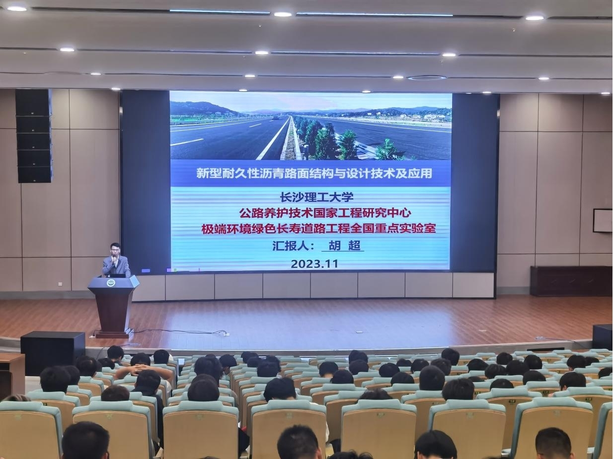 讲座上,胡博士用浅显易懂的语言解释了深奥的学术理论知识,介绍了极端环境绿色长寿道路工程实验室课题组的研究内容,其所在课题组为积极响应国家的“双碳”政策、降低资源消耗,针对现有传统沥青路面各结构层使用寿命短、面层服役环境恶劣的缺点,提出了新型耐久性沥青路面结构的设计方法与理论。提出了分层倍增的新型耐久性沥青路面结构体系和新型耐久性沥青路面的双模量弹性模型,提出了新型耐久性沥青路面的三维抗疲劳设计准则。截止到目前,其课题组提出的使用寿命为40到60年的新型耐久性沥青路面设计理论与方法已经在国内的多条高速公路上得到了广泛应用。