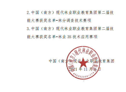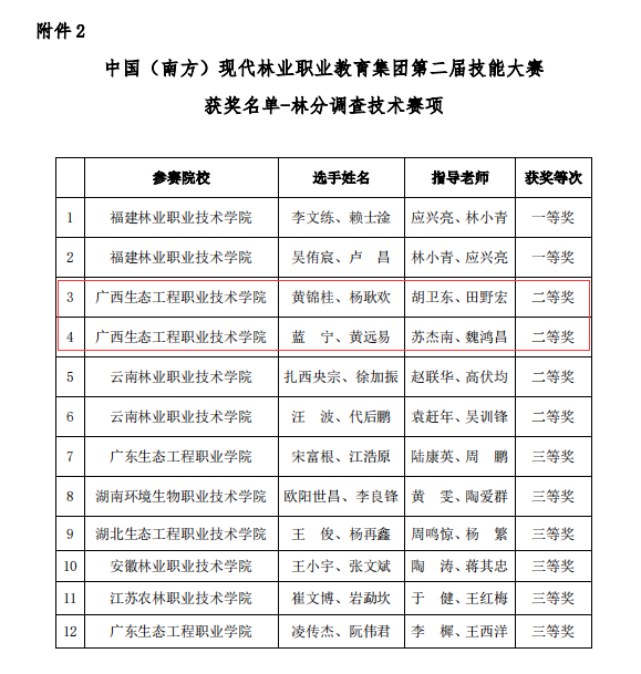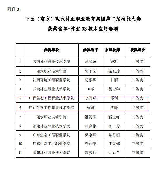 近日,中国(南方)现代林业职业教育集团公布了第二届技能大赛获奖名单,林业工程学院师生喜获二等奖4项,其中林分调查技术赛项二等奖2项(参赛学生:黄锦桂、杨耿欢,指导老师:胡卫东、田野宏;参赛学生:蓝 宁、黄远易,指导老师:苏杰南、魏鸿昌)、林业3S技术应用赛项二等奖2项(参赛学生:李万卓,指导老师:邓利;参赛学生:梁淋,指导老师:伍静)。
