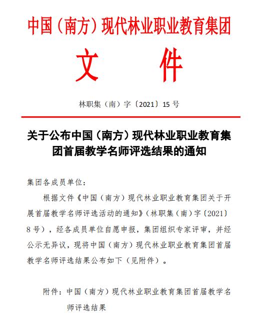 近日,中国(南方)现代林业职业教育集团公布了《关于公布中国(南方)现代林业职业教育集团首届教学名师评选结果的通知》(林职集(南)[2021] 15号)。pg娱乐园林与城乡规划学院陈翠玉教授、工业与艺术设计学院巫国富教授获评中国(南方)现代林业职业教育集团首届教学名师。