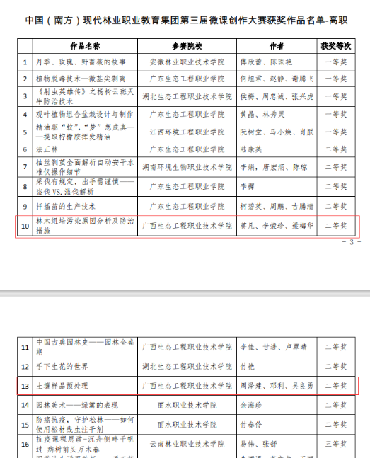 近日,中国(南方)现代林业职业教育集团公布了第三届微课创作大赛获奖作品名单,林学院蒋凡、李荣珍、梁梅华老师团队的《林木组培污染原因分析及防治措施》微课及周泽建、邓利、吴良勇老师团队的《土壤样品预处理》微课,分别在大赛中获得二等奖;廖俊云、黎良财、伍静老师团队的《基于无人机的遥感影像获取》微课在大赛中获得三等奖。
