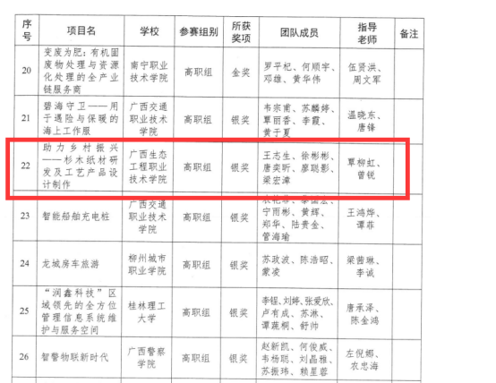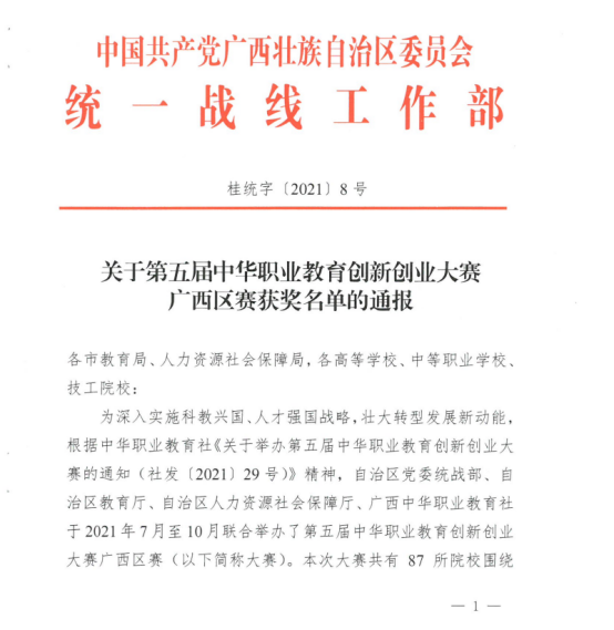 近日,由自治区党委统战部、自治区教育厅、自治区人力资源社会保障厅、广西中华职业教育社联合举办了第五届中华职业教育创新创业大赛广西区赛审结果正式公布,pg娱乐参赛团队在比赛中喜获佳绩,共有1个项目获得银奖,1个项目获得铜奖。