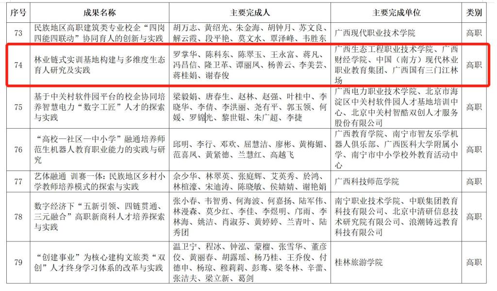近日,自治区教育厅、自治区人力资源和社会保障厅公布了2021年广西职业教育自治区级教学成果等次评定结果,由pg娱乐主导完成的《林业链式实训基地构建与多维度生态育人研究及实践》《基于“三教”改革提升“两山”建设服务能力的研究与实践》等两项成果获二等等次。这是学校“双高”建设、“三全育人”综合改革的又一标志性成果。