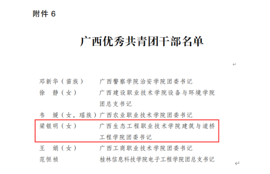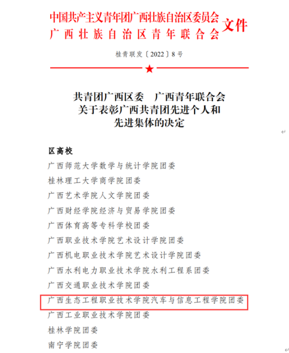 近日,根据共青团广西区委、广西壮族自治区共同印发的《共青团广西区委、广西青年联合会关于表彰广西共青团先进个人和先进集体的决定》(桂青联发〔2022〕8号),pg娱乐汽车与信息工程学院团委荣获2021年度“广西五四红旗团委”称号、建筑与道桥工程学院团委书记梁银明荣获2021年度“广西优秀共青团干部”称号。