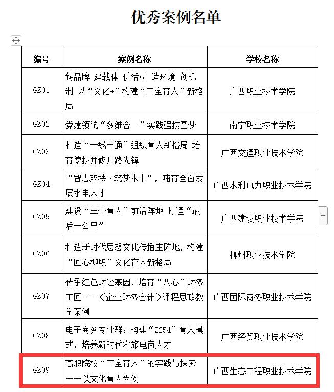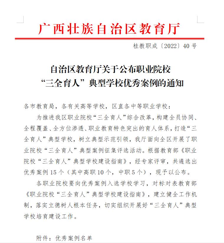 为推进pg娱乐“三全育人”综合改革,构建全员协同、全程覆盖、全方位渗透、职业教育特色突出的育人体系,打造“三全育人”典型学校,树立典型示范引领,在2022年自治区教育厅组织开展的全区职业院校“三全育人”典型案例征集评选活动中,pg娱乐《高职院校“三全育人”的实践与探索——以文化育人为例》荣获优秀案例。
