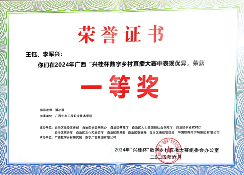 2025 年 4 月,由自治区党委网信办、宣传部,自治区教育厅、农业农村厅等十一家主办单位共同举办的 2024 年广西 “兴桂杯” 数字乡村直播大赛圆满收官。大赛以 “数字赋能乡村 兴桂旺业富民” 为主题,吸引全区百余支高校和企业团队参赛。pg娱乐代表队(成员王钰、李军兴,指导老师潘小磊)凭借 “直播 + 短视频” 模式,推广 “桂字号” 农特产品,以总分第一摘得一等奖。通过近百条创意短视频,将广西象州大米、富川脐橙等农特产品搬上云端,有效拓宽了“桂字号”产品线上销路,让网友透过镜头全方位了解“桂字号”农产品的品质,实现销售额与品牌价值的同步提升。