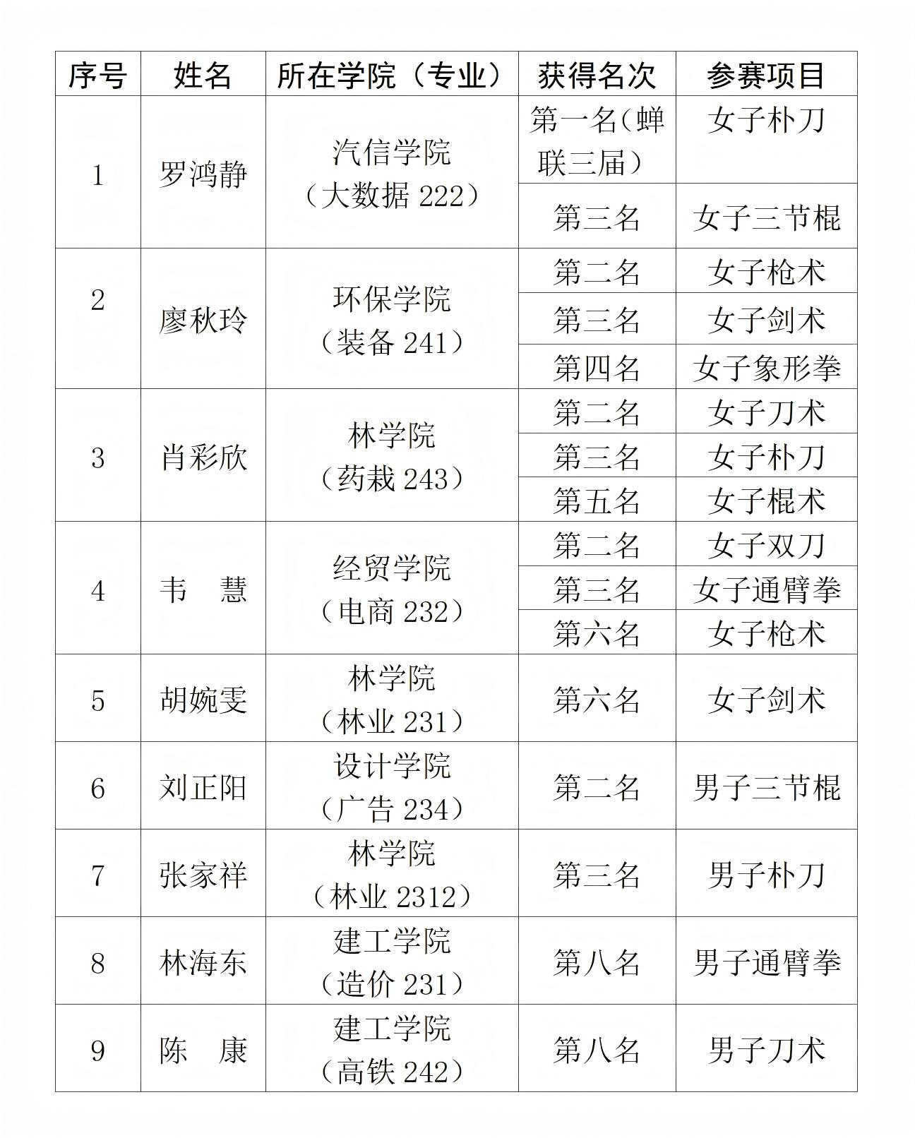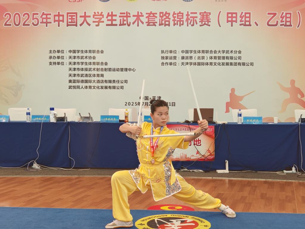 本次锦标赛由中国学生体育联合会主办,中国学生体育联合会大学武术分会执行,天津市武术协会承办,来自全国各地241所高校的2000余名运动员、教练员齐聚一堂,竞争激烈,高手如云。pg娱乐派出了由黄小民老师担任领队、李震老师担任教练,来自各二级学院共9名同学组成的武术代表队参赛,经过为期五天的激烈角逐,参赛队员均展现出卓越实力,全部跻身各自项目八强行列,并最终摘得多项奖牌,成绩斐然。其中,罗鸿静同学已蝉联三届获女子朴刀赛项金牌,且获女子三节棍赛项铜牌;廖秋玲同学获女子枪术银牌、女子剑术铜牌;肖彩欣同学获女子刀术银牌、女子朴刀铜牌;韦慧同学获女子双刀银牌、女子通臂拳铜牌;刘正阳同学获男子三节棍银牌;张家祥同学获男子朴刀铜牌。
