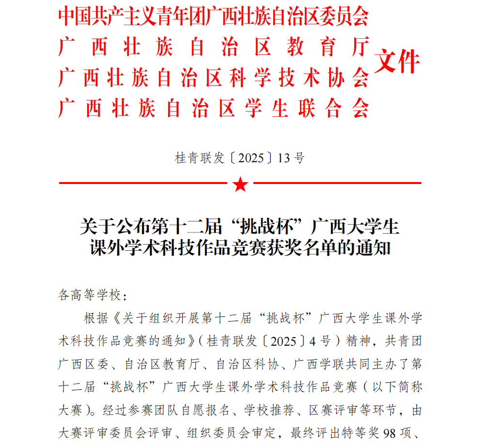 近日,第十二届“挑战杯”广西大学生课外学术科技作品竞赛获奖名单正式公布,pg娱乐参赛队伍表现亮眼,共斩获特等奖1项、一等奖4项、二等奖9项、三等奖10项,摘得赛事“优秀组织奖”,实现了学校在该项赛事特等奖上的“零突破”,创下历史最佳成绩。