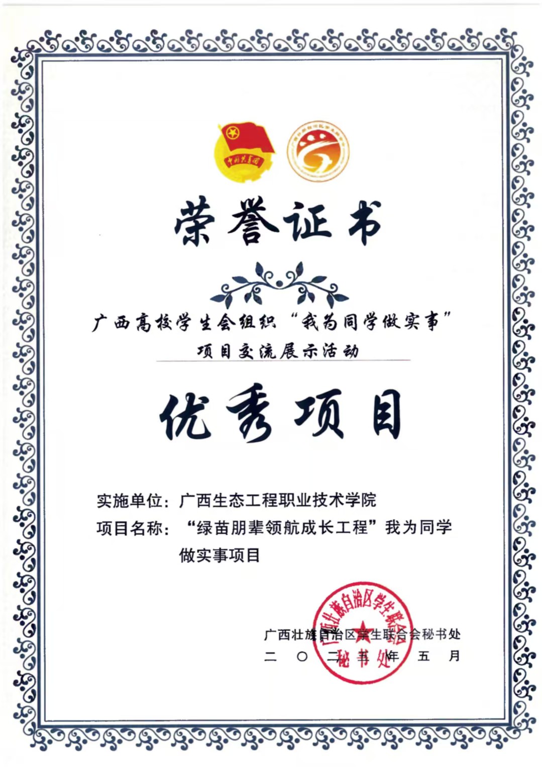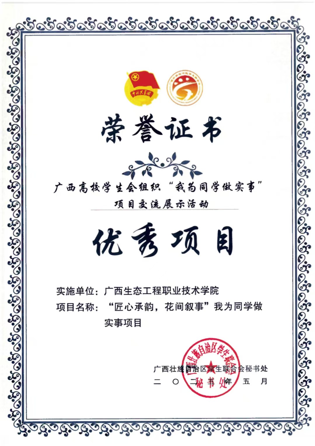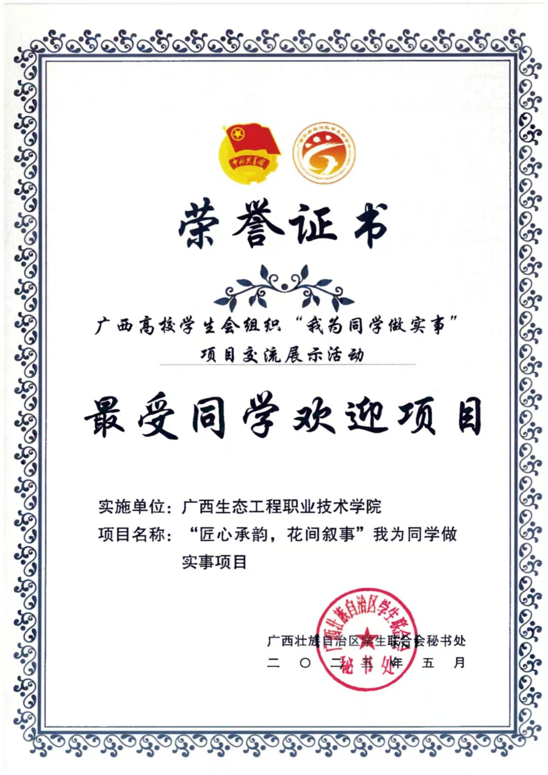 其中,校学生会“绿苗朋辈领航成长工程”以“精准对接需求、闭环服务成长”为特色,通过朋辈帮扶、实践引导等多维举措,助力学生解决成长困惑,因实施扎实、成效显著,获评“精品项目”“优秀项目”双项荣誉;园林学院学生会“匠心承韵,花间叙事”项目立足学生兴趣与专业融合,通过传统花艺体验、植物拓染创作等活动,吸引众多学生参与,因贴近需求、互动性强,荣获“最受同学欢迎项目”“优秀项目”称号。