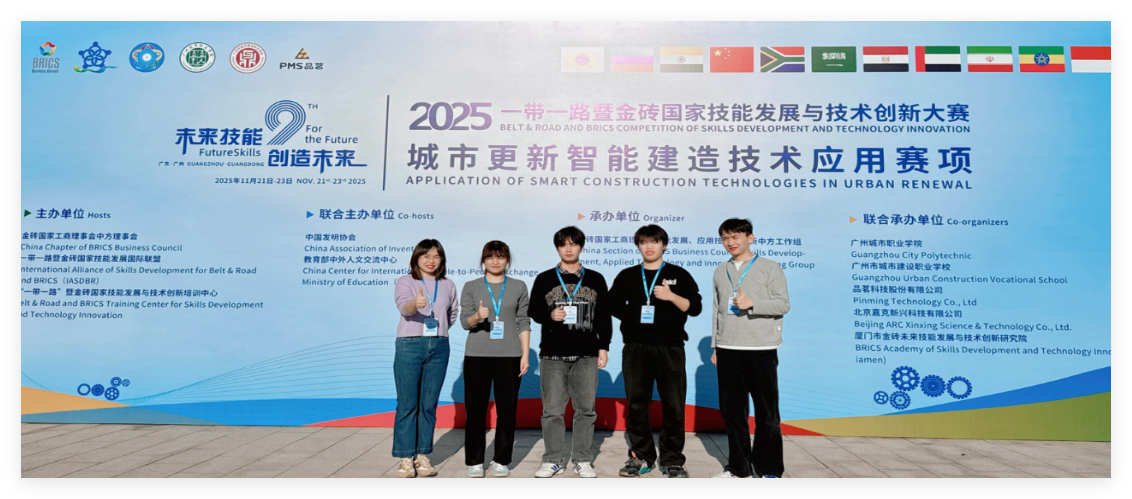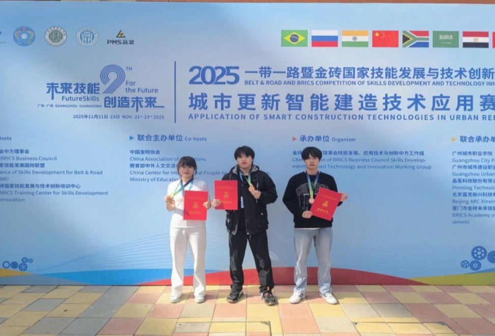 近日,2025“一带一路”暨金砖国家技能发展与技术创新大赛城市更新智能建造技术应用赛项全国总决赛在广州落幕。pg娱乐选派的由岑彩玲、黄品新、李学杰三位学生组成的参赛团队,在指导教师戴伟娥、肖承友的悉心指导下,凭借扎实的专业功底与出色的团队协作,从众多参赛队伍中脱颖而出,成功斩获铜奖。