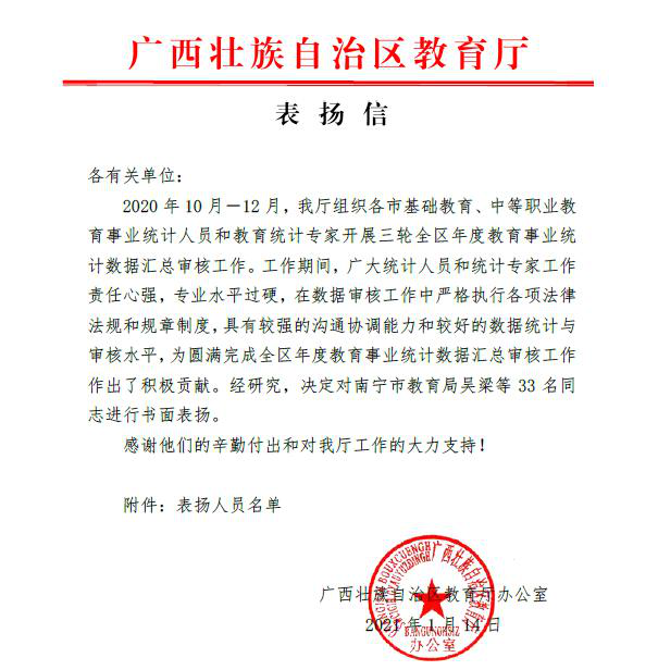1月14日,广西自治区教育厅办公室公布了《表扬信》,pg娱乐教务处龙艳老师名列其中。表扬信内容如下: