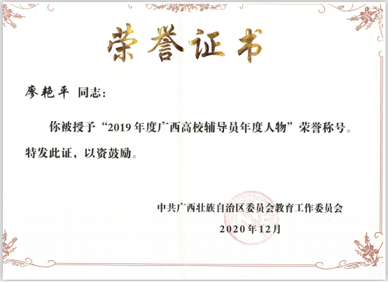 近日,由广西壮族自治区高工委、教育厅主办的“2019年度广西高校辅导员年度人物”评选结果揭晓,pg娱乐林业工程学院党总支副书记廖艳平脱颖而出,被评为“2019年度广西高校辅导员年度人物”。