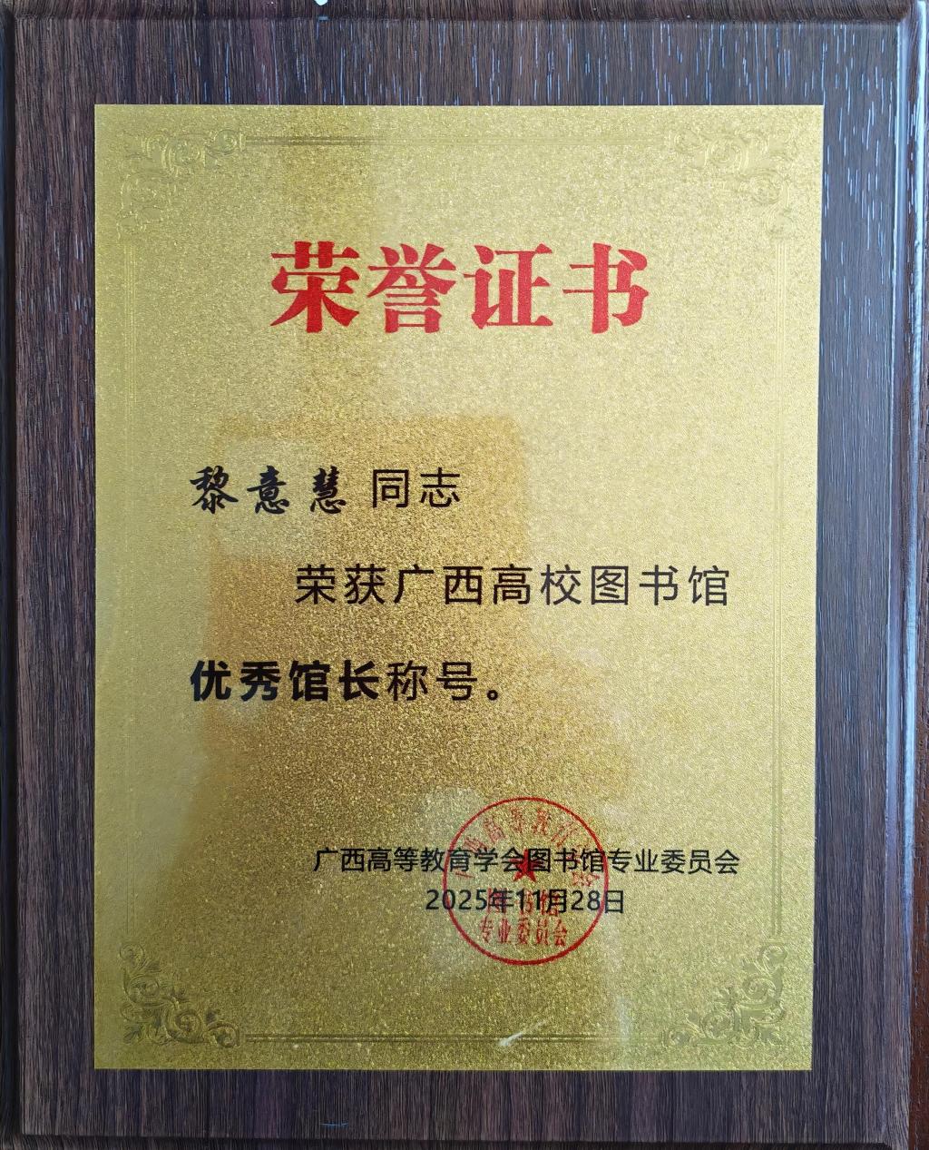 近日,广西高等教育学会图书馆专业委员会公布2025年广西高校图书馆先进集体、优秀馆长和优秀馆员评选结果,pg娱乐图书馆副馆长(主持工作)黎意慧凭借出色的专业能力和卓越的工作业绩,荣获“广西高校优秀馆长”称号,是唯一取得该荣誉的高职高专院校图书馆负责人。