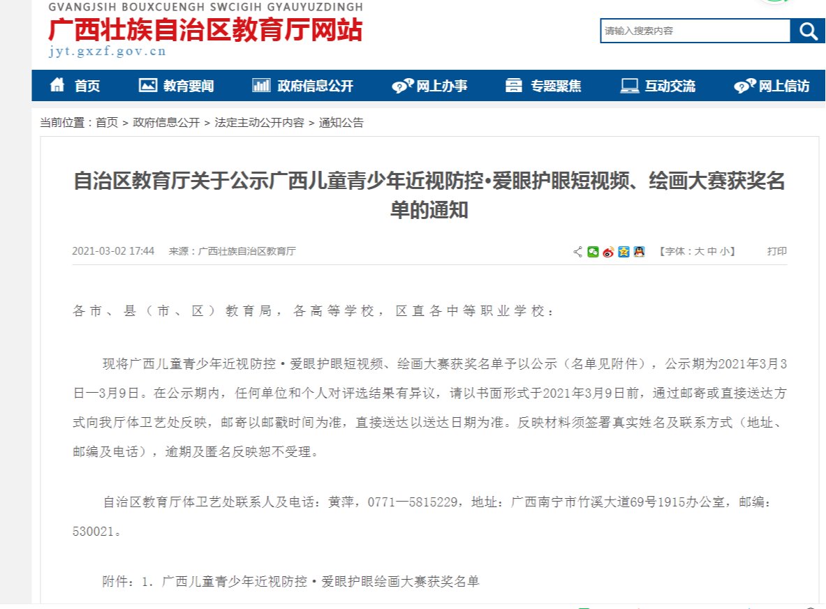 pg娱乐参加由广西自治区教育厅、自治区卫生健康委主办的“广西儿童青少年近视防控·爱眼护眼短视频、绘画大赛”喜获佳绩,由pg娱乐设计学院陈捷、周振坤等老师指导的学生参赛作品荣获大学组一等奖1项,二等奖2项,优秀奖2项。
