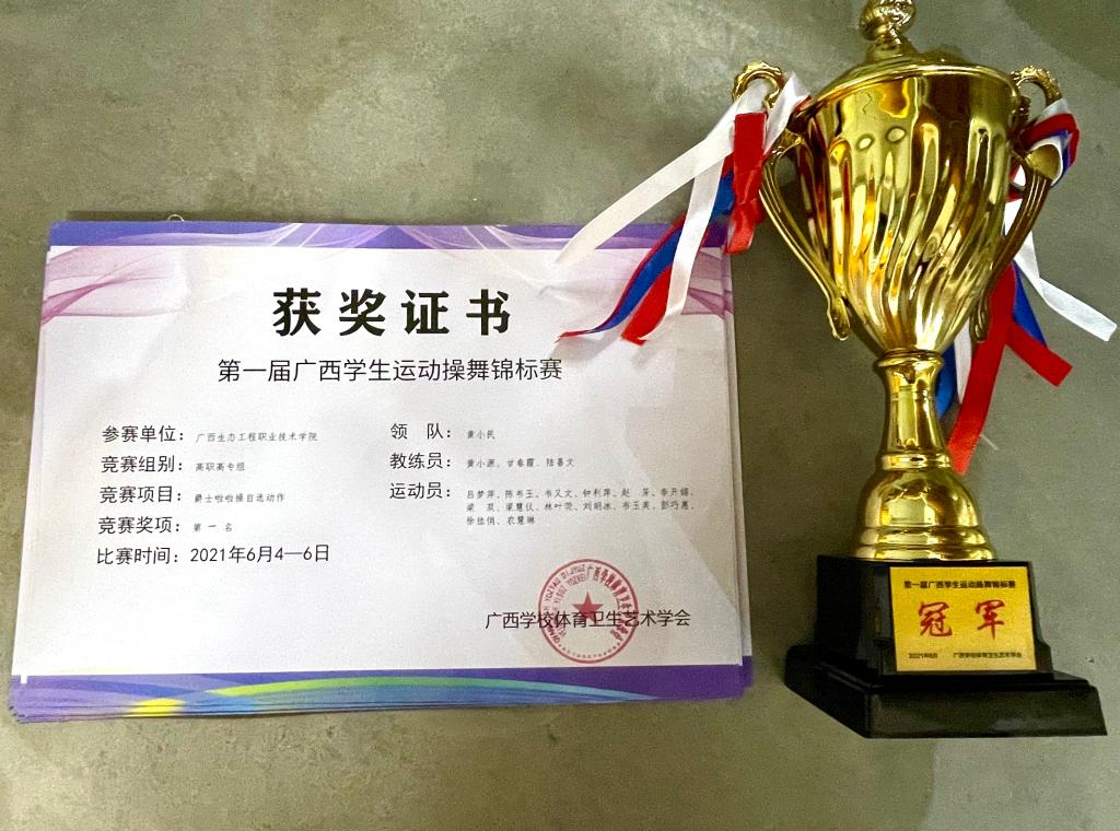 6月5日,第一届广西学生运动操舞锦标赛暨第一届广西高校大学生健身瑜伽锦标赛在广西民族大学思源湖校区体育馆开幕。pg娱乐由通识教育学院黄小民院长领队、通识教育学院黄小源、甘春霞、陆喜文三位老师担任教练员的健美操舞团队荣获爵士啦啦操冠军、街舞季军、排舞第五名的优异成绩。