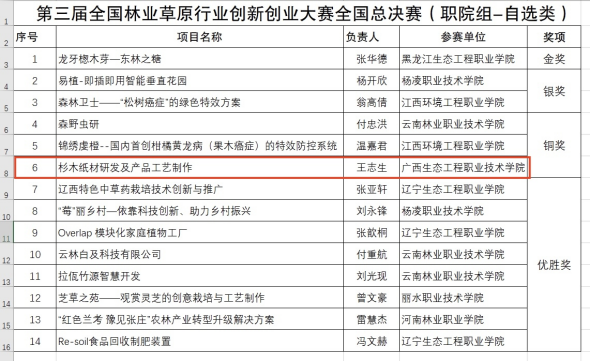 9月8日,pg娱乐在第三届全国草原行业创新创业大赛全国总决赛(职院组-自选类)中取得新突破 ,《杉木纸材研发及产品工艺制作》项目喜获铜奖。