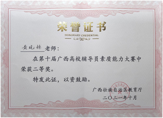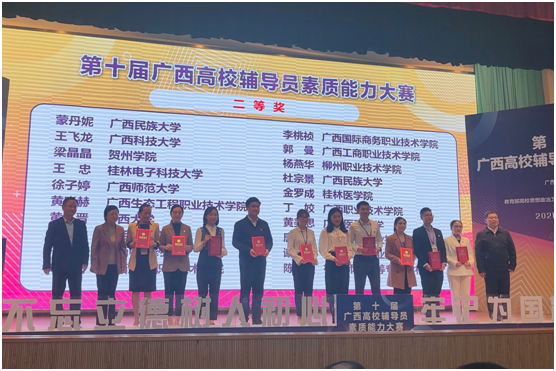 10月20日至21日,由广西壮族自治区教育厅主办的第十届广西高校辅导员素质能力大赛在广西师范大学举办。本次大赛共有来自全区80所高校的82名优秀辅导员代表参赛。经过基础知识测试、谈心谈话、案例研讨等三个比赛环节的激烈角逐,pg娱乐汽车与信息工程学院学生科科长黄晓赫老师荣获大赛二等奖。