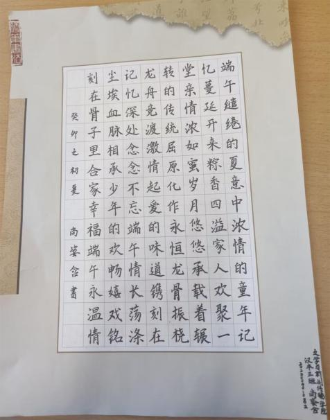 “粽情端午 古韵流长”端午节书法比赛为热爱书法的同学提供了一个锻炼艺术感知能力的途径和展现自我的平台,能够对同学们的身体、心理、思维等多个方面起到积极的影响。“以笔绘端午 以情系万家”手抄报比赛,引导学生感受传统节日的文化底蕴,同学们认真构思,精心设计,将对亲人、老师和同学的祝福通过绘制手抄报的形式传达出来。“手绘彩蛋,情浓端午”彩蛋绘制活动,将中华优秀传统文化融入到我们日常生活中,学生们通过一个小小的蛋壳模型与颜料的结合,寄托出每个人心中的佳节愿景。“诗意端午 绳编五色”五彩绳编制活动中,一条条彩色的绳线在学生们灵巧的指尖穿梭飞跃,一个个绳结融入学生们的美好祝愿。本次活动传达着浓浓的节日氛围,在大家的共同努力下,评选出多名优秀学生作品,本次活动取得圆满成功。