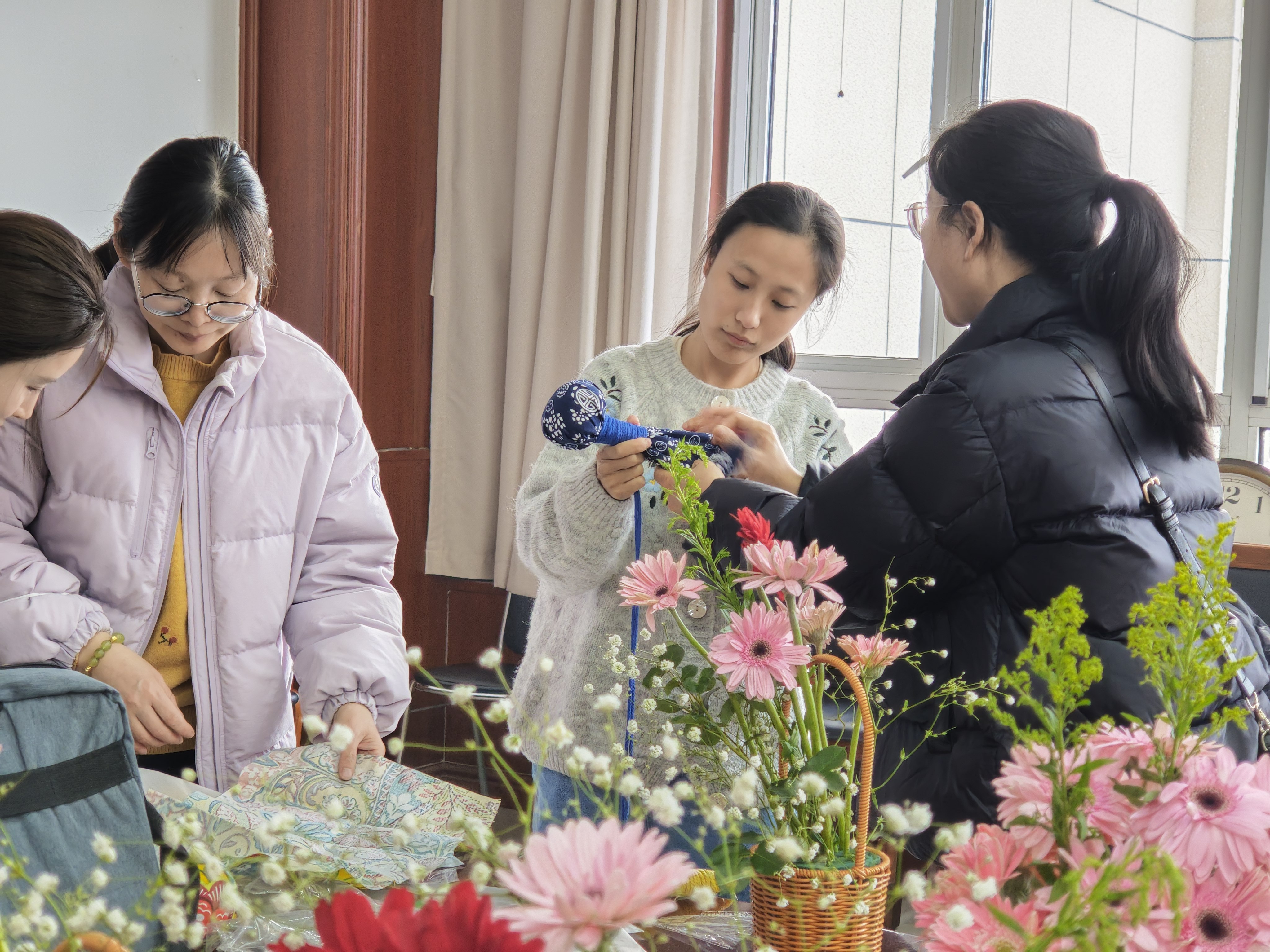 活动现场欢声笑语,春意融融。在艺术插花区域,教职工们发挥创意,将玫瑰、康乃馨、向日葵等花材精心搭配,制作出一个个象征美好与祝福的花篮。“插花是心灵的对话,今天不仅学到了技艺,更感受到生活的诗意。”老师捧着自己的作品感慨道。 串珠制作区则是一片专注的氛围,彩色琉璃珠在指尖流转,化作精致的手链、挂饰。大家互帮互助,分享配色心得,原本零散的珠子逐渐串联成独一无二的艺术品。而古法艾草锤手工体验更是别具匠心,教职工们填充艾草、捆扎棉布,制作出兼具传统养生智慧与实用价值的健康锤。“自己做的艾草锤,既能按摩肩颈,又能感受中医药文化,太有意义了!”王老师兴奋地展示成果。