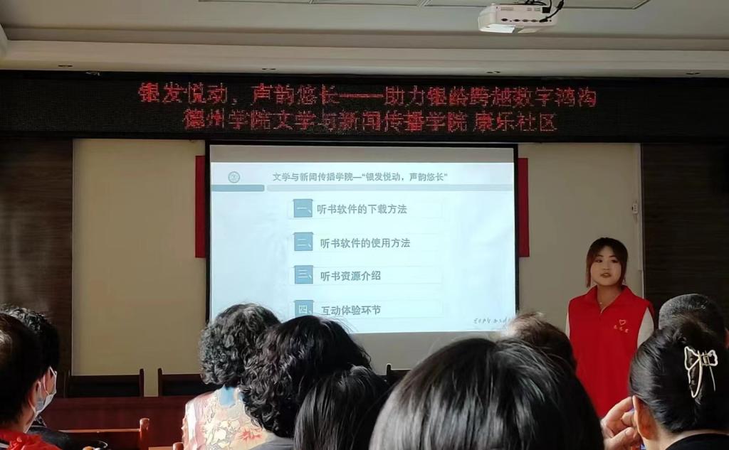 为丰富老年人的精神生活,提升老年人的记忆力、注意力和思维能力,教会老年人用耳聆听网络书籍、节目等资源,5月14日,文学与新闻传播学院走进康乐社区开展"银发悦动,声韵悠长"助力银龄跨越数字鸿沟主题社会实践活动。