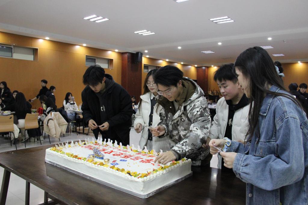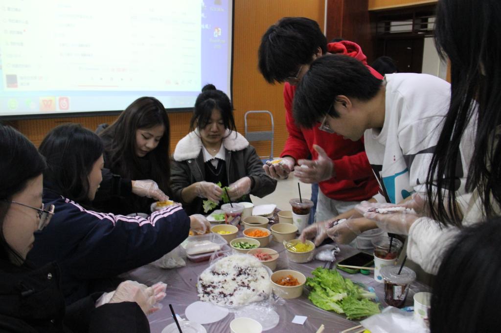 “冬至阳生春又来”,在这个岁末的冬至佳节,暖冬活动于激昂的歌声中热烈开场。动人的旋律似冬日暖阳,瞬间驱散寒意,点燃了现场的热情,将大家带入轻松愉悦的氛围。此时,户外虽寒风凛冽,室内却暖意融融,一场温馨欢乐的聚会正当时。在食材准备过程中,各种趣味小游戏轮番登场。在你画我猜中,比划的同学手脚并用,猜词的同学全神贯注,欢笑声此起彼伏;抢凳子环节,参与者绕凳疾转,音乐停即抢座,伴随着同学们的呐喊助威,将现场气氛推向高潮。这些游戏不仅带来了欢乐,更在无形中增进了同学们之间的了解与信任,让大家在轻松的氛围中学会了团队协作与沟通技巧。伴随着游戏的欢乐进行,大家亲手制作的饭团、热气腾腾的饺子,以及散发着宜人香气的冬日养生茶纷纷被端上桌来,同学们围坐一处,畅快地品尝着自己的劳动成果,家人们虽不在身边,但此刻身边的伙伴就是亲人,大家心连着心,一同度过这个特别的冬至,让团圆之情在温暖的氛围中不断延续。