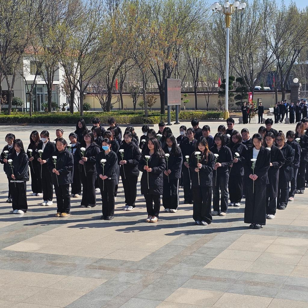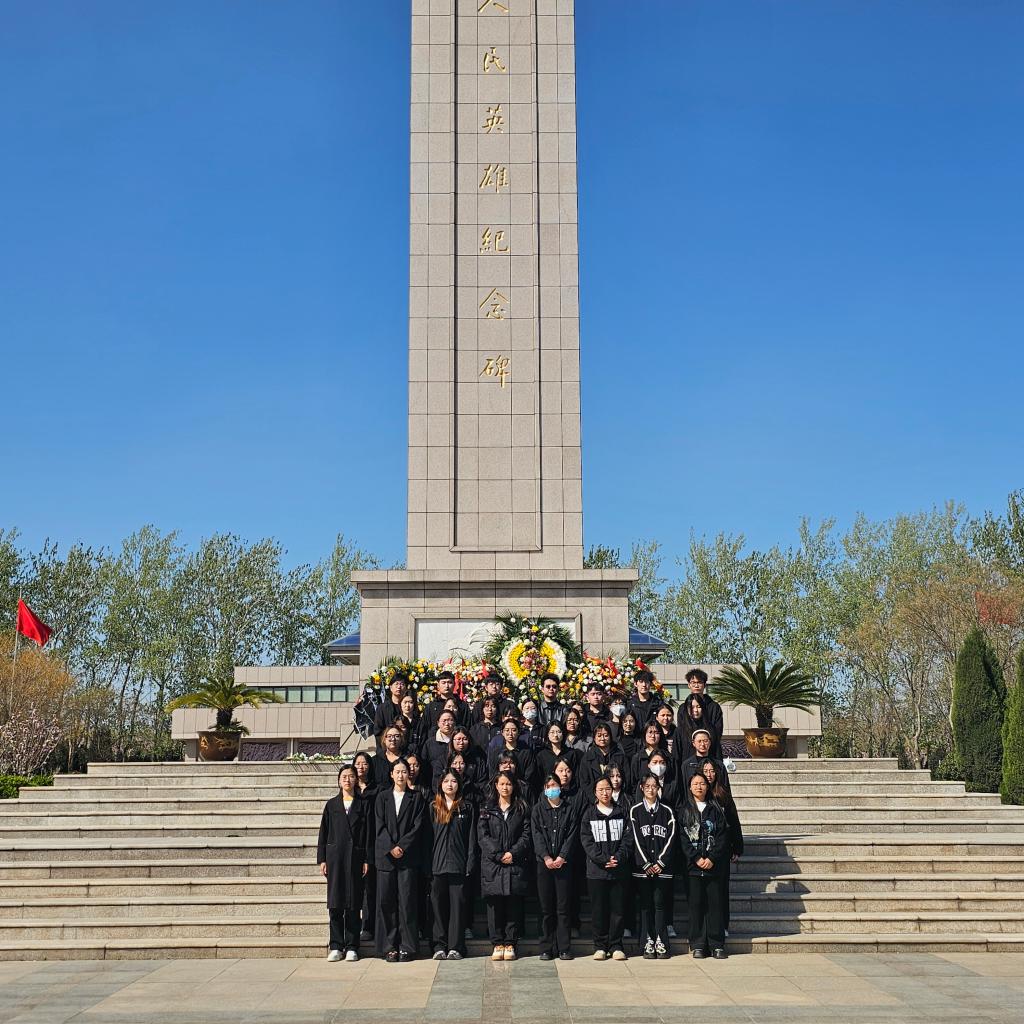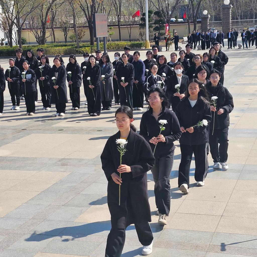 在庄严肃穆的氛围中,同学们皆身着一袭黑衣,身姿挺拔如松,整齐划一地肃立在雄伟庄严的人民英雄纪念碑之下。每一个人都神情凝重,目光中满含着沉痛与敬仰,在一片静谧中,静静地默哀。他们以无声的伫立,传递着内心深处对英烈们最诚挚的敬意与无尽的追思,这份情感深沉而浓烈,在空气中弥漫开来。默哀仪式结束后,同学们手捧着淡雅的白菊花,迈着缓慢而沉稳的步伐,秩序井然地走向纪念碑基座。他们轻轻将鲜花献上,每一朵花都寄托着同学们对先烈们绵延不绝的思念。