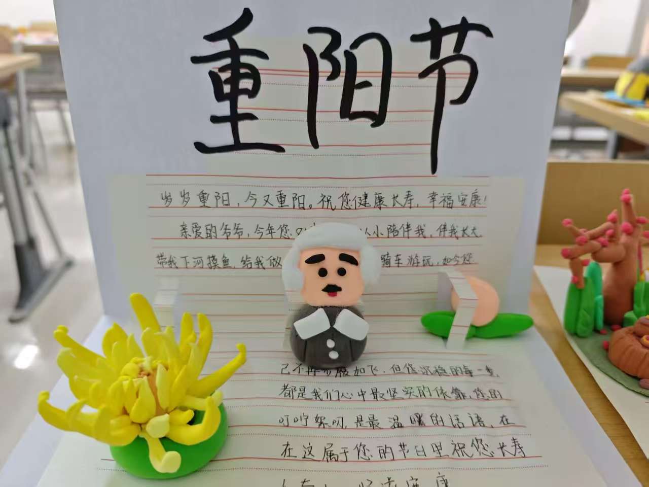 此次活动不仅为同学们提供了一个表达对长辈敬爱之情的平台,更让大家在动手与书写的过程中,深入感受到传统节日的文化内涵。同学们在创作中重温与长辈相处的温暖点滴,在文字间深化了对敬老传统的理解。这份由黏土与书信共同编织的重阳记忆,将成为连接两代人情感的独特纽带,激励着同学们将尊老敬老的优良传统融入日常,化为行动。
