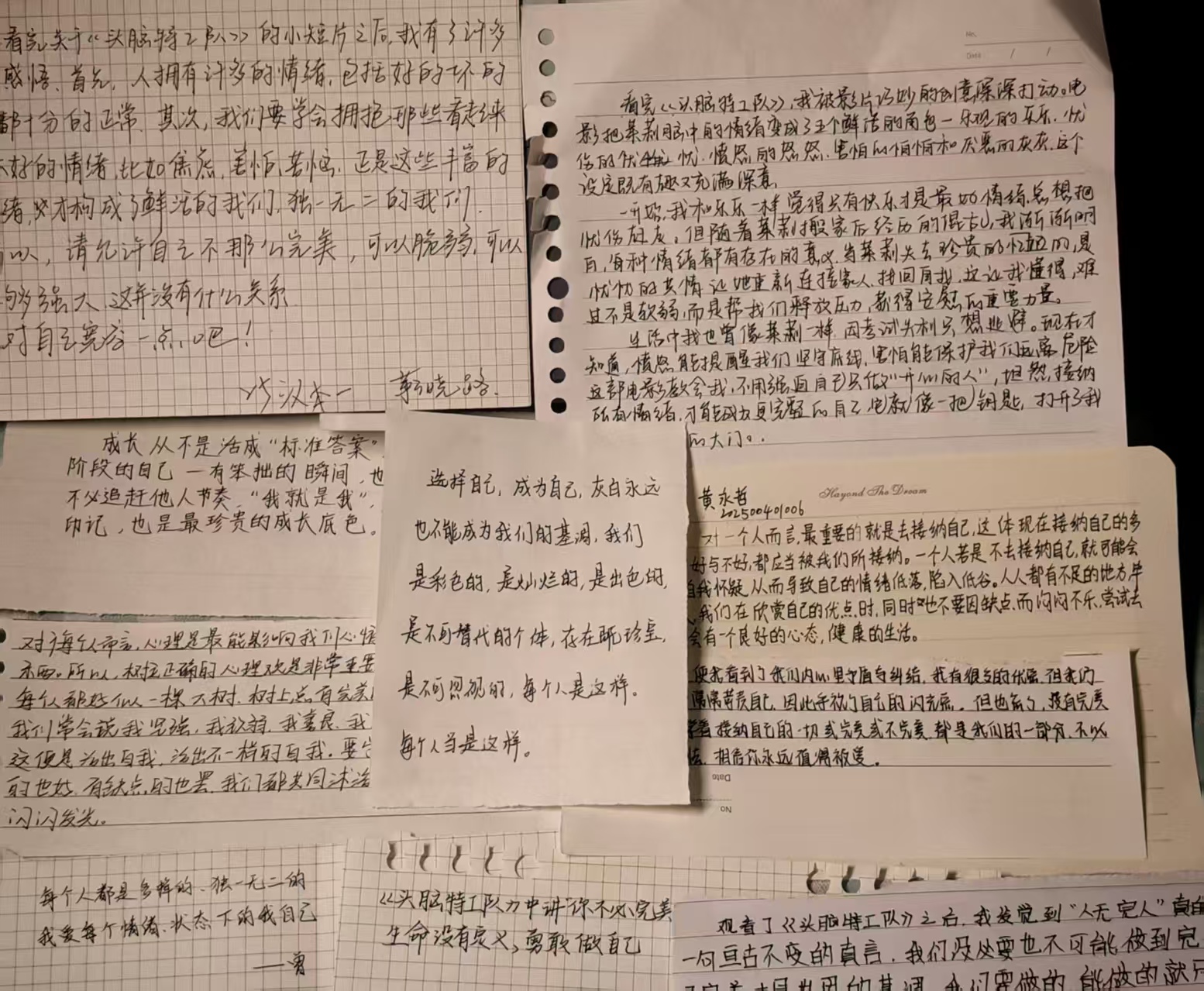 活动“情绪初印象”破冰环节开同学们围绕“喜、怒、哀、惧、厌”五种情绪,分享近期生活中的情绪故事,引出对情绪管理的初步思考。随后,大家集体观看动画电影《头脑特工队》,影片以生动具象的方式,将情绪在脑海中的运作机制可视化,进一步加深了同学们对情绪功能与互动的理解。观影结束后,学生完成手写感悟并进行互动分享,影片内容自身情绪体验结合起来,明确情绪的多元属性及不同情绪在自我成长中的作用。