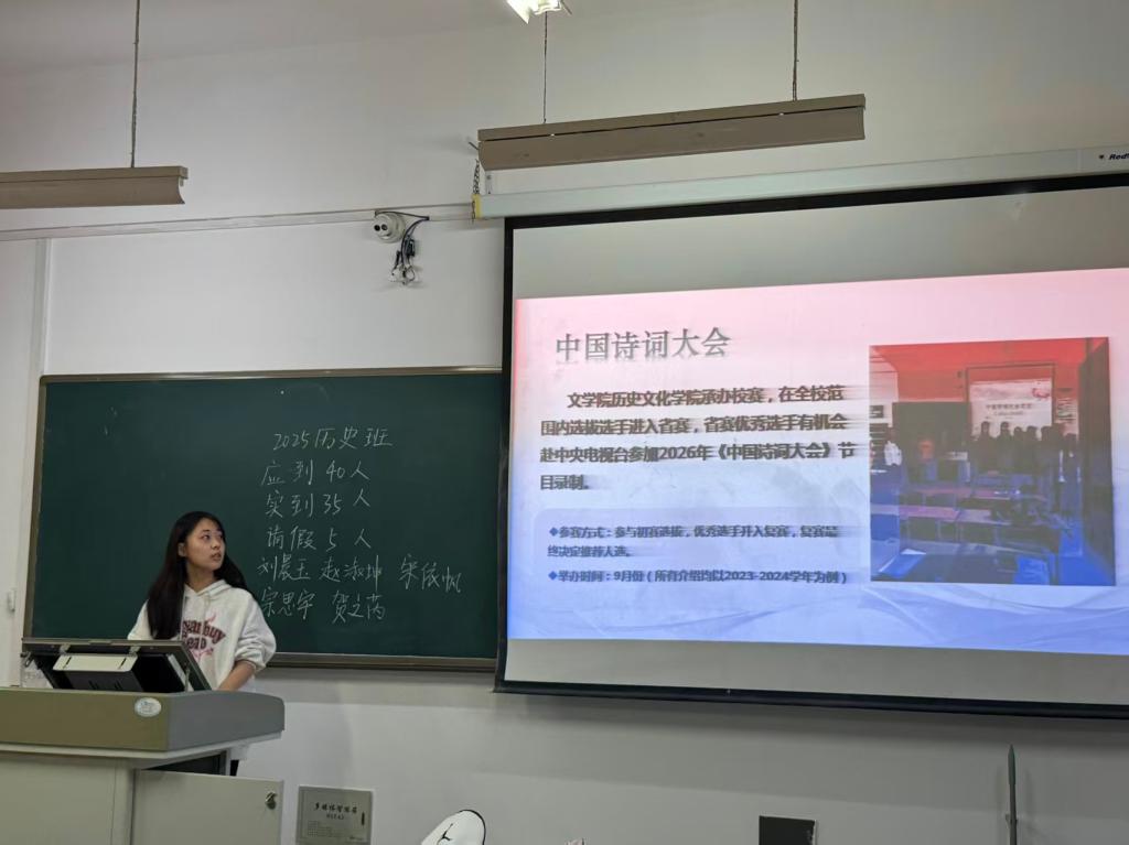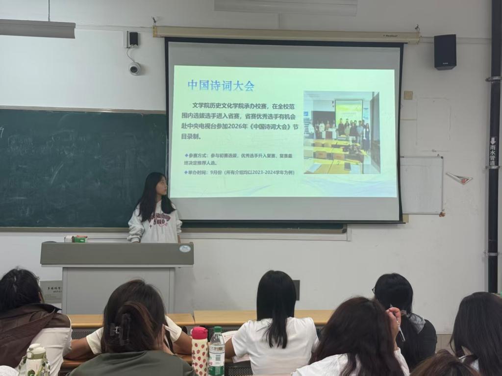 本次活动以“经典回顾+文化解读”的形式展开,通过系统介绍中国诗词大会的文化价值、报名流程、备赛技巧及学院历年参赛荣誉,为新生搭建起从聆听诗词到参与实践的文化桥梁。宣讲人在宣讲中鼓励新生积极拥抱诗词世界,强调“只要心怀热爱,人人皆可成为诗词舞台的主角”,为同学们带来一场知识性与感染力并重的文化盛宴。