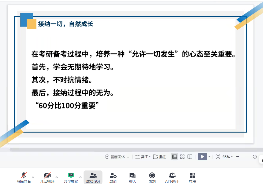 为做好2025年研究生复试、调剂服务工作,帮助考研学子更加充分地做好复试准备,1月22日,bat365中文官方网站线上举办考研复试、调剂经验交流会。副院长马超主持会议,考研辅导教师俞泽峰、黄雯、刘希云、李冬英等现场为学生们做考研事宜的解答,并有近100位学生积极参加活动。