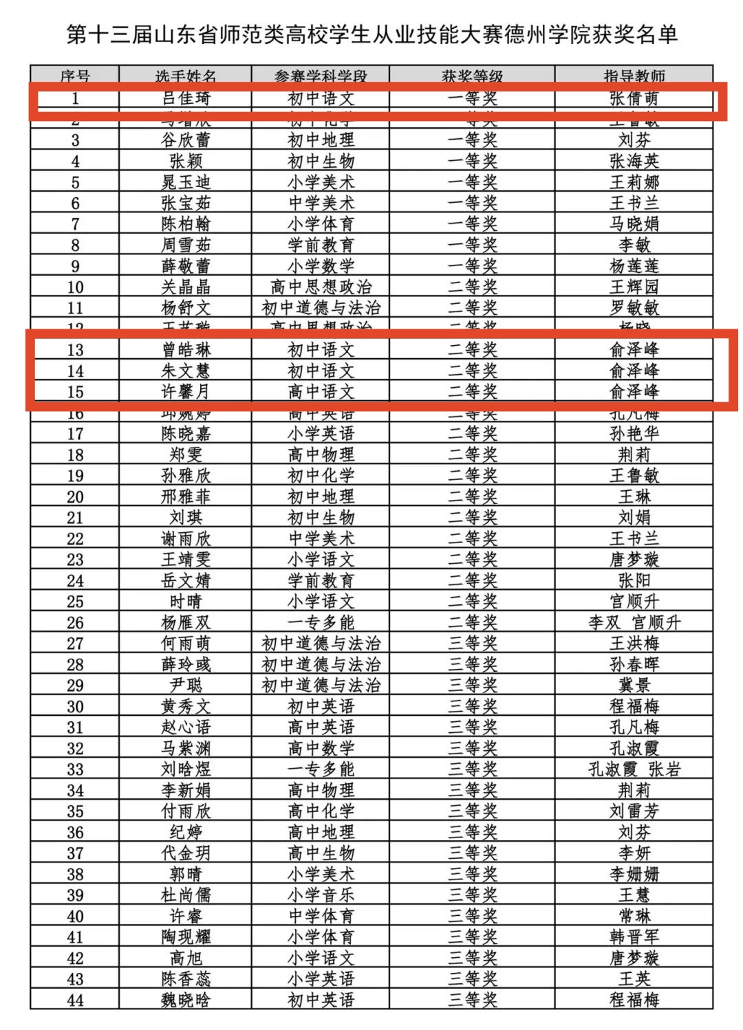 bat365官网选手凭借扎实的专业功底和教学智慧,展现了出色的课堂驾驭能力。其中,初中语文组吕佳琦以扎实功底和出色表现荣获一等奖第一名,朱文慧、曾皓琳荣获二等奖,高中语文组许馨月荣获二等奖。选手们从容自信的教态、将知识讲解与素养培育巧妙融合的教学设计,充分彰显了学院学生的综合能力。