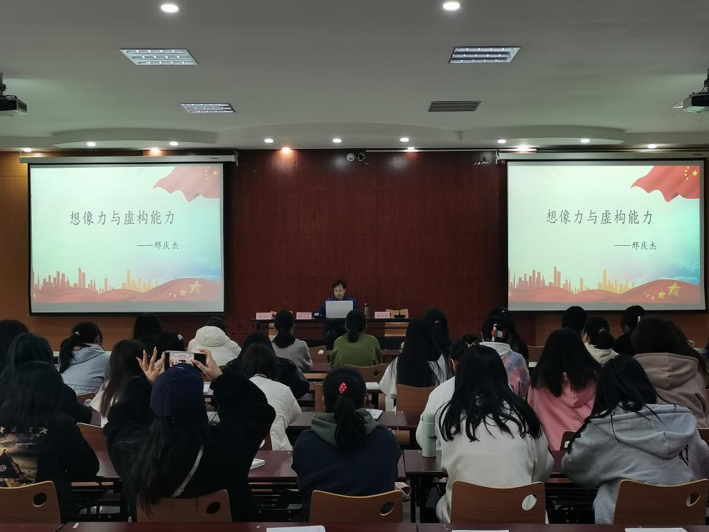 捐赠仪式前,邢庆杰主席向同学们做了《想象力与虚构能力》的讲座。他首先介绍了个人的文学成长之路,他由一个农民子弟,怀着文学梦想,克服种种困难,最终成为国家一级作家,他的个人成长经历对同学们极具震撼作用。接着他从自己的一部小说入手,采用文本细读的方式,分析一部好的作品的构思过程,以及在这一过程中作家如何充分地运用想象力进行虚构。