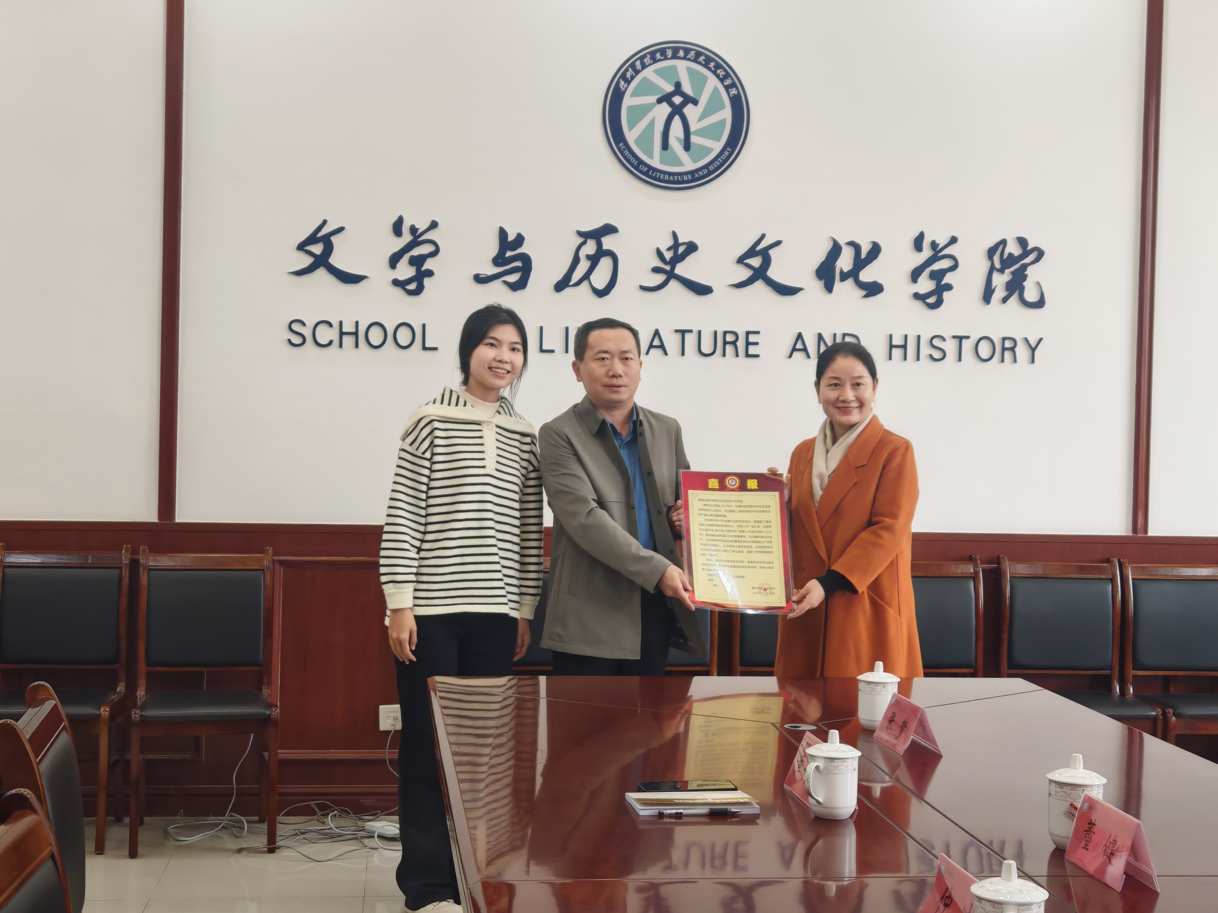 10月31日 ,德州市第十五中学党支部书记、校长董健一行人到访bat365中文官方网站,向在教育实习中表现优秀的bat365官网学子赠送喜报。学院党委书记仲冲,党委副书记、副院长黄传波,学生指导老师陈雪,辅导员沙彦君接待。双方在博文楼329会议室座谈交流。