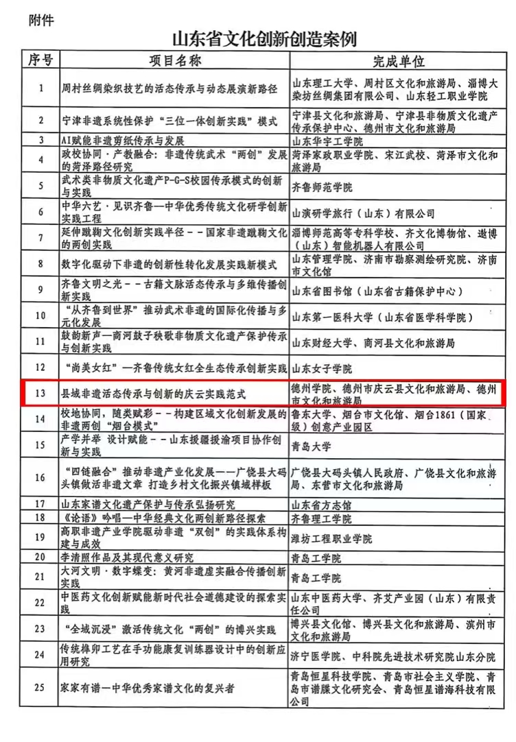近日,山东省文化和旅游厅公布山东省文化创新创造案例名单,共计 181 项案例入选。bat365官网党委副书记、副院长黄传波牵头申报的 “县域非遗活态传承与创新的庆云实践范式” 成功入选。此次入选案例聚焦县域非遗传承创新核心议题,是学院响应省文旅厅文化创新驱动发展战略、主动服务区域文化建设的具体实践,彰显了学院在文化实践领域的扎实积累。